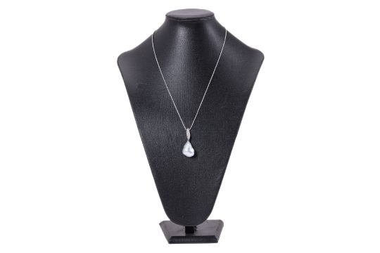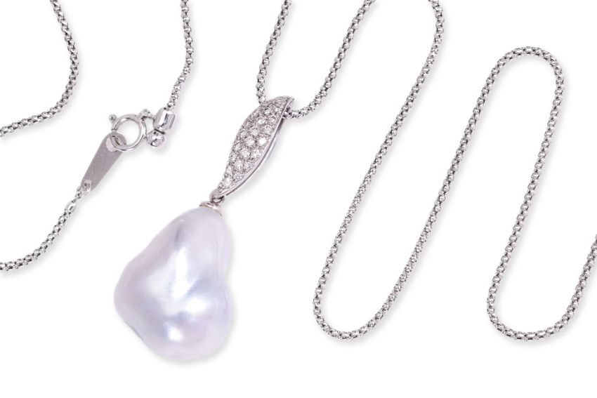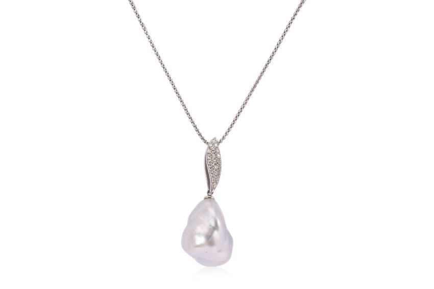 Featuring a south sea cultured baroque pearl measuring approximately 17.2 x 22.0mm, mounted to a white gold setting marked 'K18WG' for 18K, accented with round brilliant cut diamonds totalling approximately 0.23 Cts (marked). Accompanied with an adjustable white gold chain marked 'K18WG' for 18K.