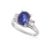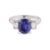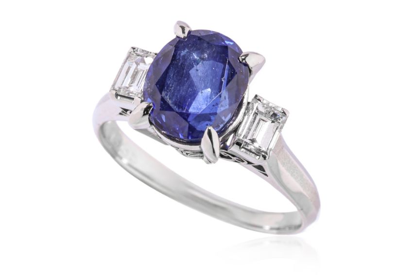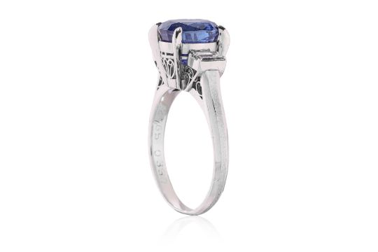 Featuring an oval cut blue sapphire weighing approximately 2.765 Cts (marked), mounted in a platinum setting marked 'Pm900', flanked by two baguette cut diamonds totalling approximately 0.33 Cts (marked).