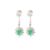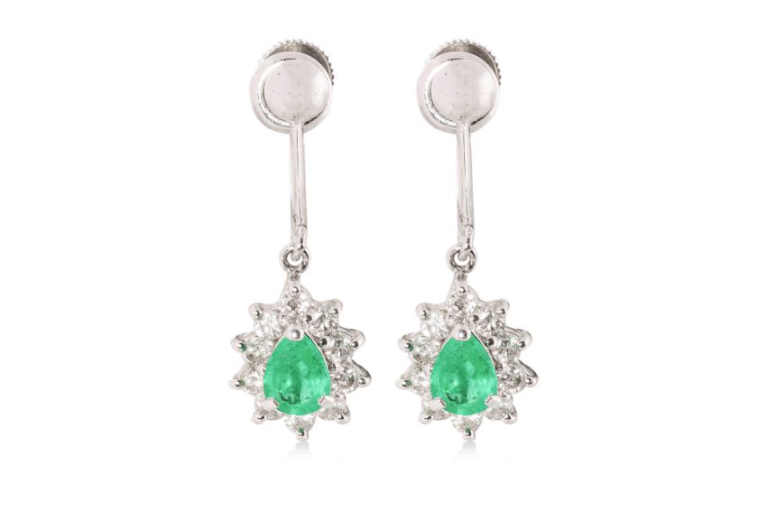 Featuring pear shaped emeralds totalling approximately 0.67 Cts (marked), mounted in a platinum setting marked 'Pt850', additional maker's mark spotted, likely for 'Honora', accented with round brilliant cut diamonds totalling approximately 0.64 Cts (marked).