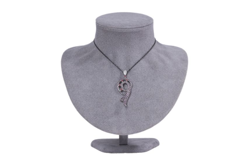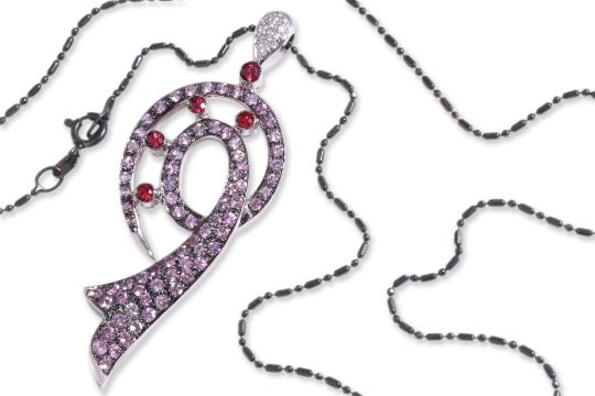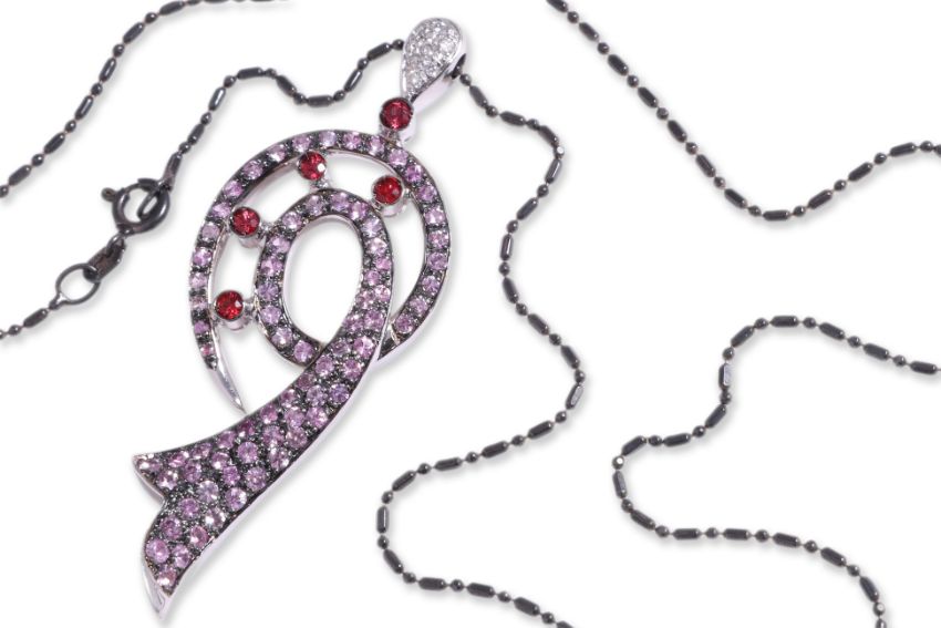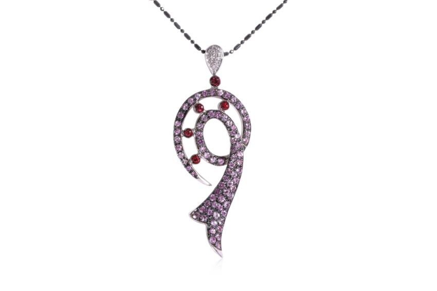 Featuring round cut pink sapphires totalling approximately 2.80 Cts, mounted in a two tone gold setting marked '750' for 18K, accented with round cut garnets totalling approximately 0.25 Cts and round brilliant cut diamonds totalling approximately 0.14 Cts.