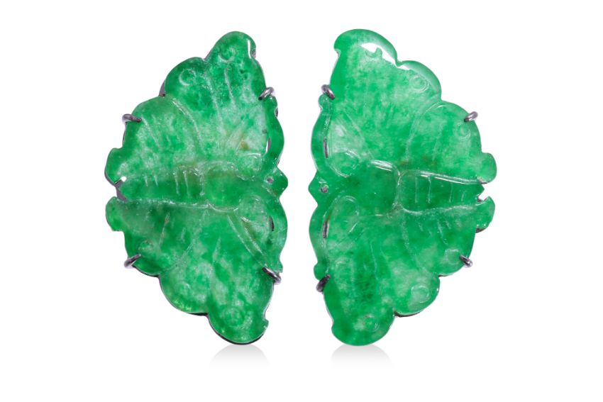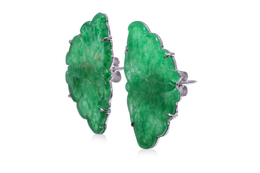 Featuring a pair of jade pieces in the form of butterflies, likely type B+C jadeite, mounted in a white gold setting marked '750' for 18K to the stud backings.