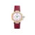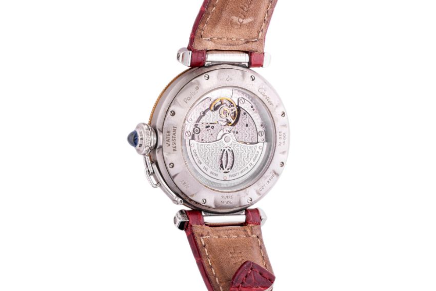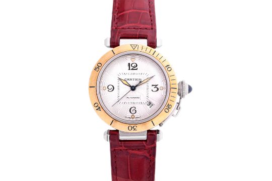 Men's/unisex watch with silvered guilloche dial, Arabic numerals, date window, stainless steel case with uni-directional 18k yellow gold bezel, self-winding movement, maroon leather Cartier strap, with additional strap and red fabric pouch