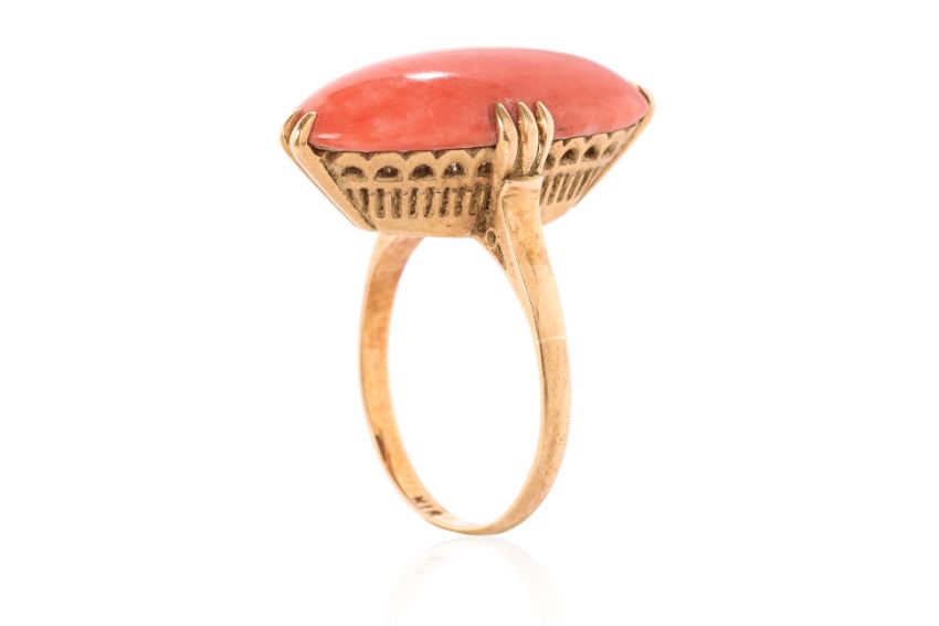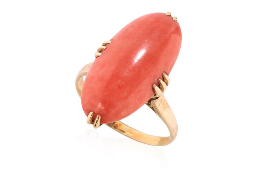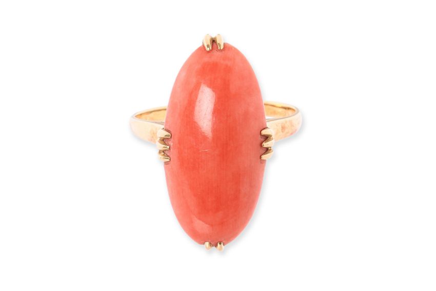 Featuring a marquise coral cabochon, mounted in a yellow gold setting marked 'K18' for 18K.