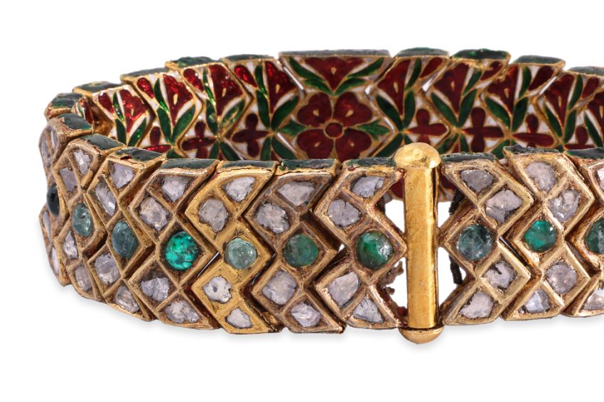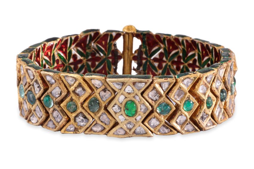 Featuring foil backed cabochons, possibly emeralds, mounted in a tested yellow gold setting with enamelled floral motifs, accented with foil backed diamond chips. Likely of Indian origin, circa late 19th to 20th century.