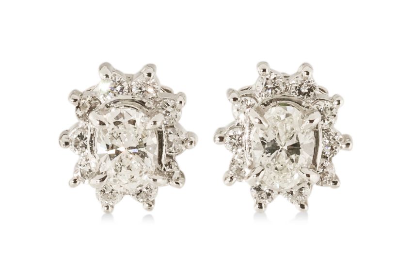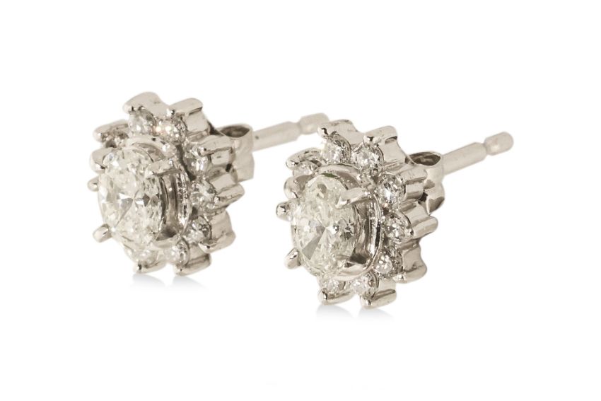 Featuring a pair of oval cut diamonds totalling approximately 0.34 Cts, mounted in a platinum setting marked 'Pt900' 'Pt850', accented with round brilliant cut diamonds totalling approximately 0.20 Cts.