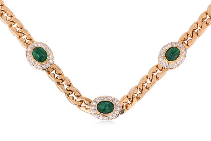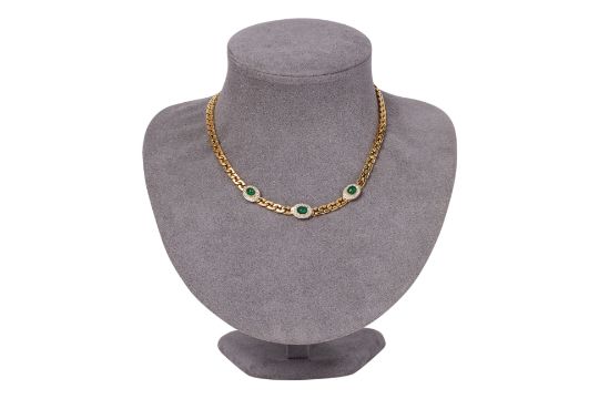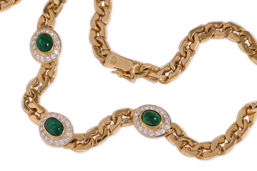 Featuring emerald cabochons weighing approximately 2.10 Cts, mounted in a yellow gold curb link chain marked '750' for 18K, accented with round brilliant cut diamonds totalling approximately 0.48 Cts.
