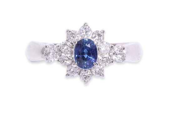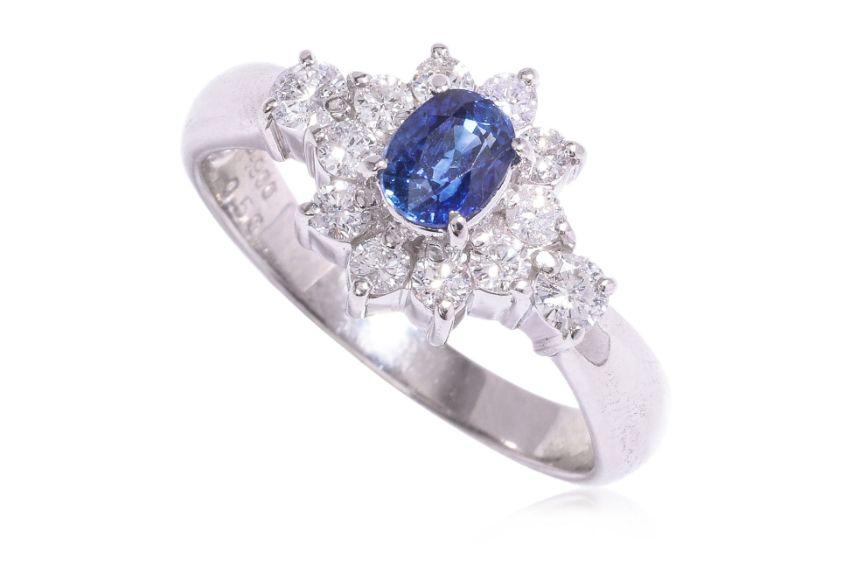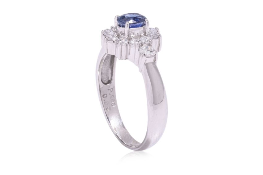 Featuring an oval shaped sapphire weighing approximately 0.66 Cts (marked), mounted in a platinum setting marked 'Pt900', accented with round brilliant cut diamonds totalling approximately 0.50 Cts (marked).