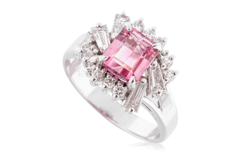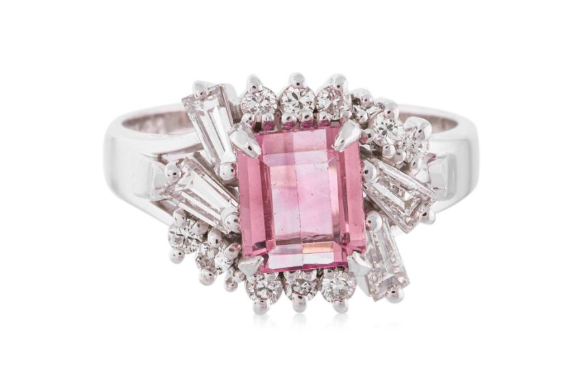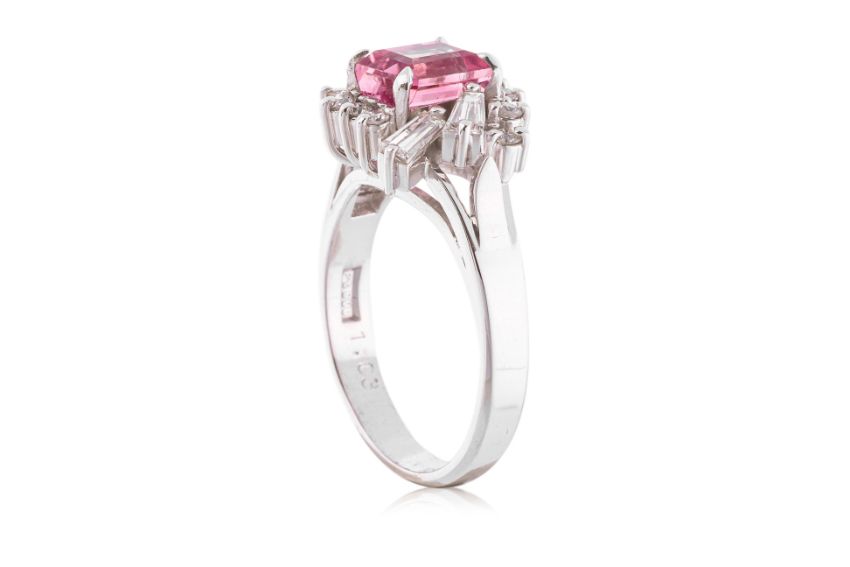Featuring a pink tourmaline weighing approximately 1.67 Cts (marked), mounted in a platinum setting marked 'Pt900', accented with round brilliant and tapered baguette cut diamonds totalling approximately 1.03 Cts (marked).