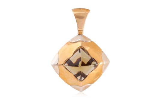 Featuring a 'pyramid' shaped smokey quartz mounted in a two tone gold setting stamped '750' for 18K, alongside maker's mark 'BVLGARI', with Italian assay mark '3022AL'.