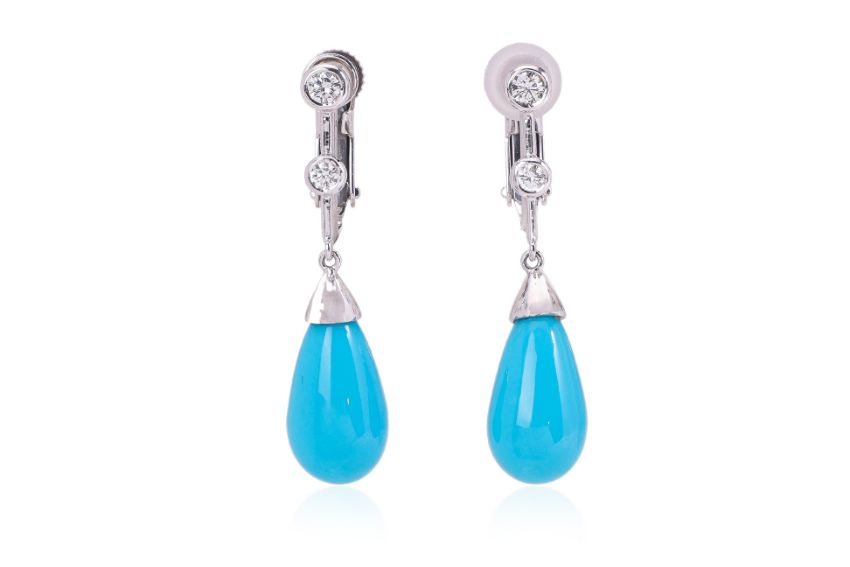 Featuring a pair of turquoise drops measuring approximately 11.5 x 7.0mm each, mounted in a white gold setting marked 'K18WG' for 18K to the main portion, 'K14WG' for 14K to the screw-on portion, accented with round brilliant cut diamonds totalling approximately 0.13 Cts.