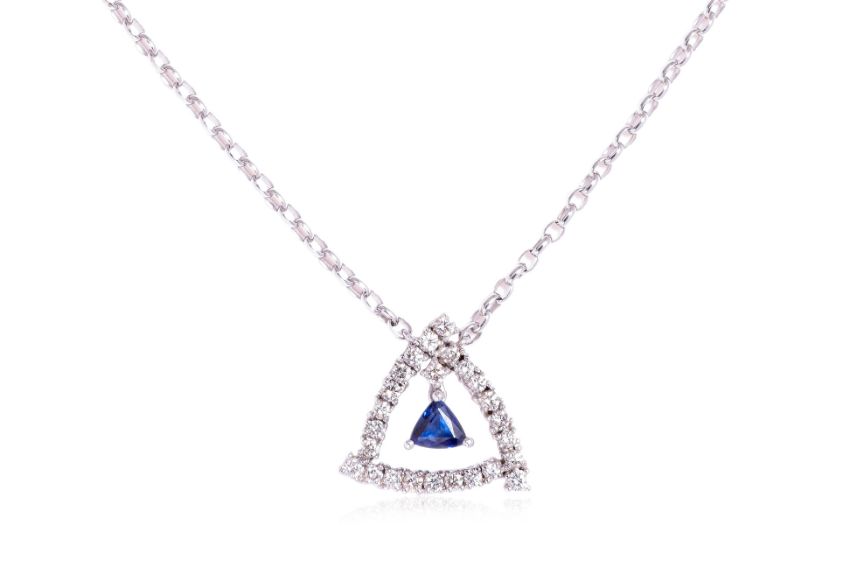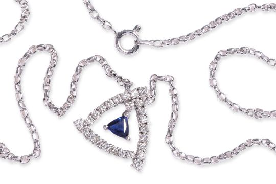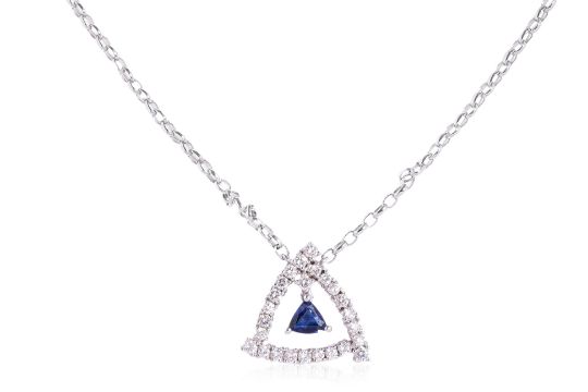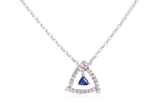Featuring a triangular shaped sapphire weighing approximately 0.50 Cts, mounted in an unmarked white gold setting, accented with round brilliant cut diamonds totalling approximately 0.62 Cts.