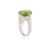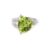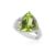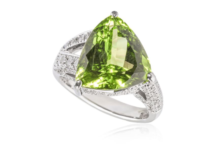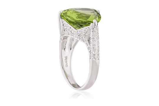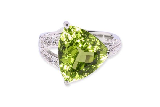 Featuring a trillion cut peridot weighing approximately 9.57 Cts (marked), mounted in a platinum setting marked 'Pt900', accented with round brilliant cut diamonds totalling approximately 1.01 Cts (marked).