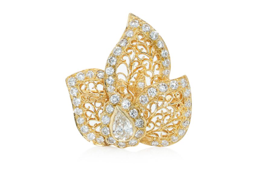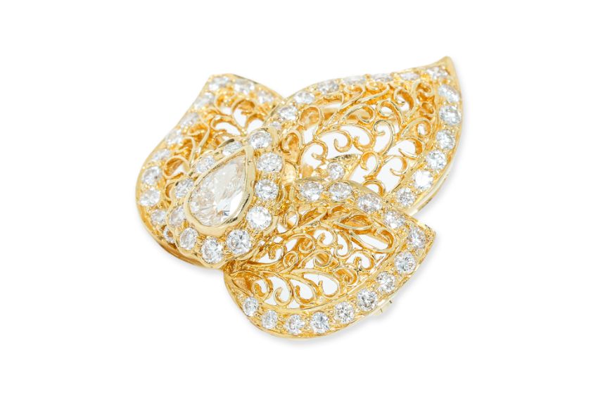 Featuring a pear shaped diamond weighing approximately 0.30 Cts, mounted in a yellow gold setting with partially rubbed marks of '750', for 18K, accented with round brilliant cut diamonds totalling approximately 0.70 Cts.