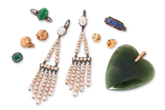 To include a nephrite pendant with a yellow gold bail marked '9Ct' for 9K, a silver mounted emerald pin head, a silver mounted jade and pearl ring, a pair of silver mounted pearl dangle earrings, a blue paste stone ring marked '14K', a pair of gold earrings marked '14K' to the backings and a pair of unmarked yellow gold earrings.