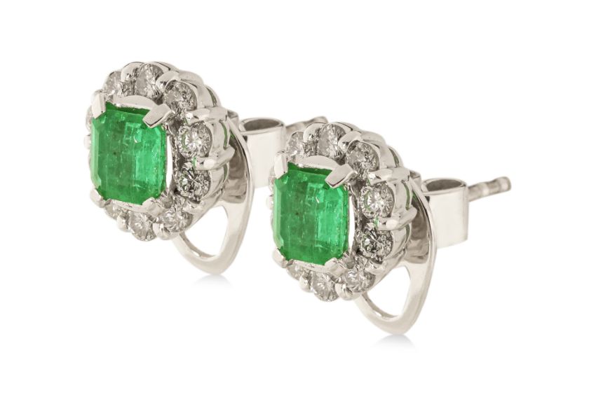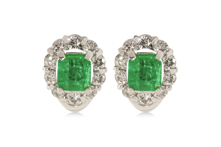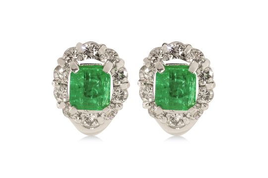 Featuring a pair of emerald cut emeralds totalling approximately 0.80 Cts, mounted in an unmarked white gold setting, accented with round brilliant cut diamonds totalling approximately 0.50 Cts.