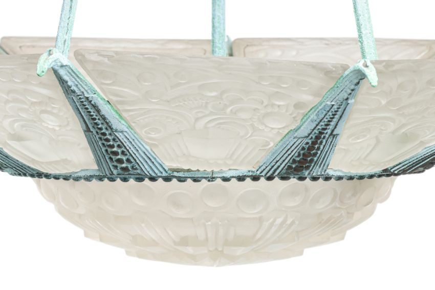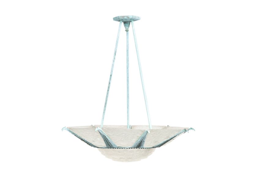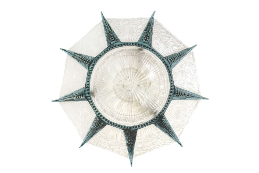Likely French, early 20th century, featuring ten panels of pressed glass mounted in a patinated metal frame