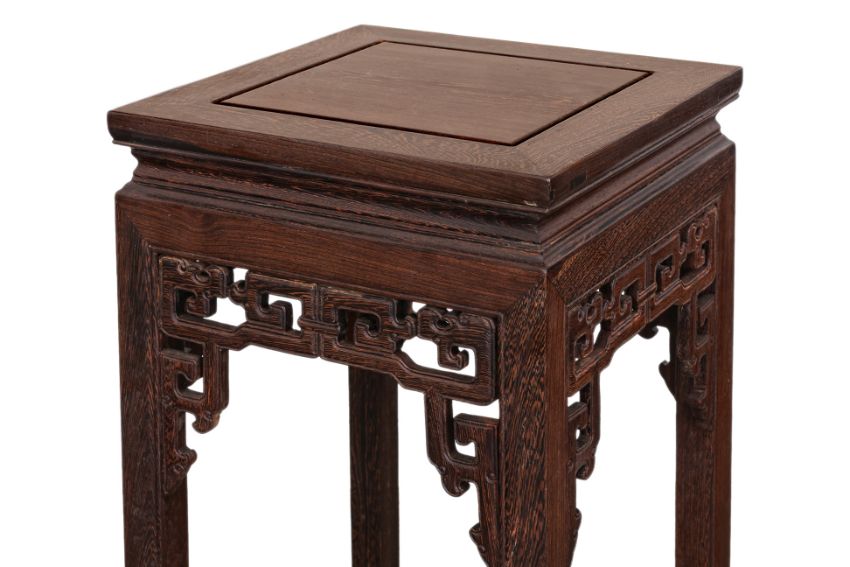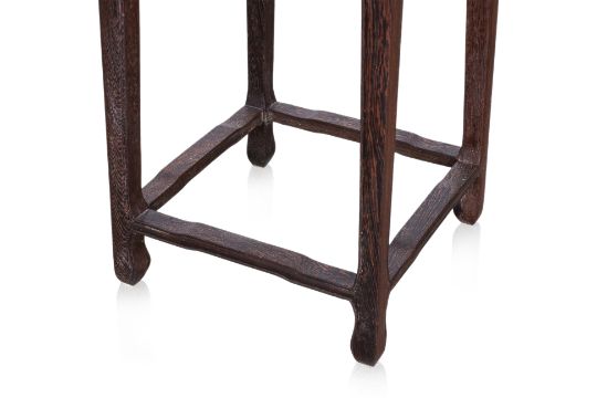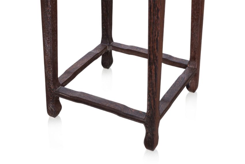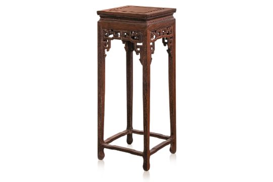 Square, with carved and pierced archaic scroll apron, teh square supports with moulded edge, joined by humpback stretchers