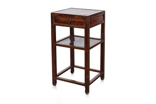 Circa early 20th Century, square, fitted with a single shallow drawer above a shelved undertier, the moulded square supports joined by stretcher rails