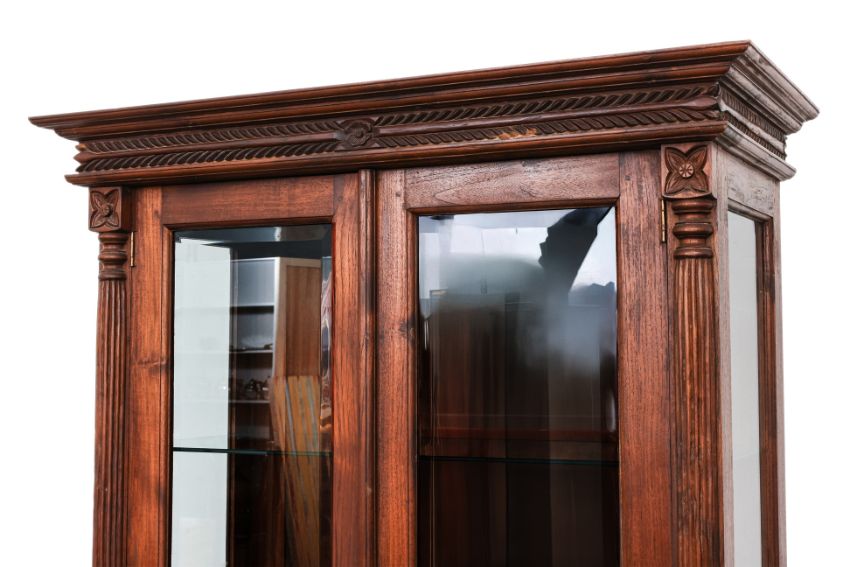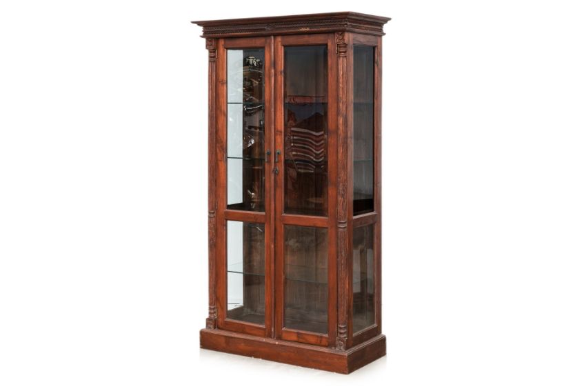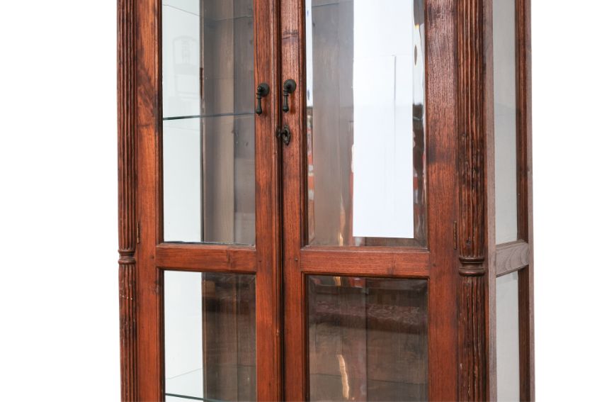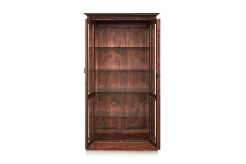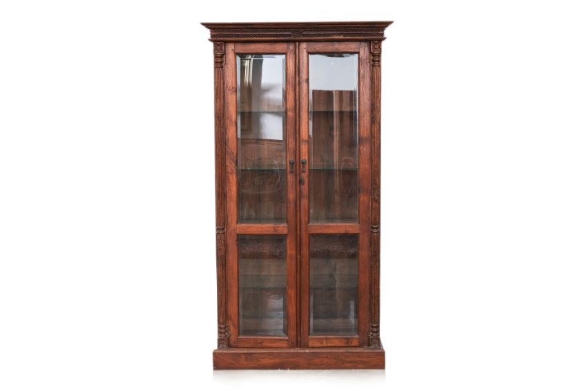 Featuring glazed double doors to front and glazed sides, enclosing four glass shelves, decorated with fluted columns and carved cornice