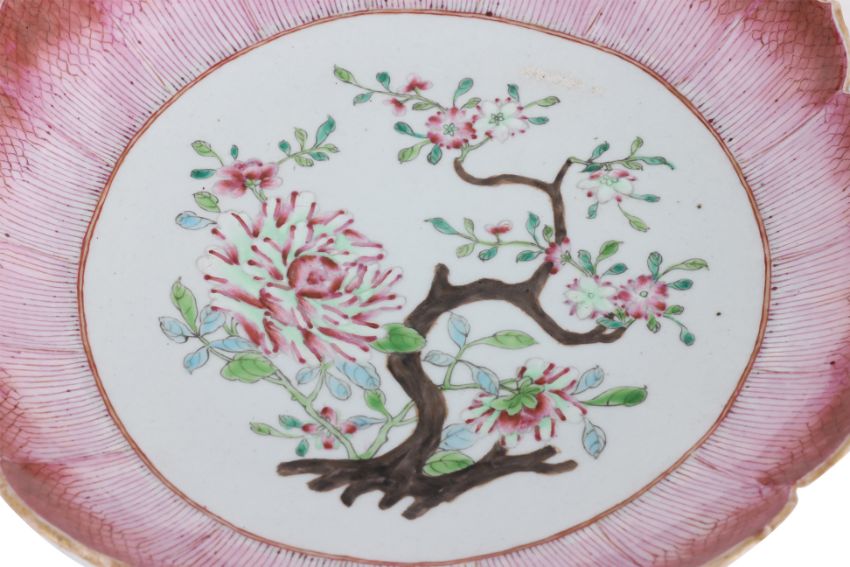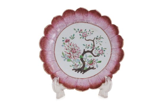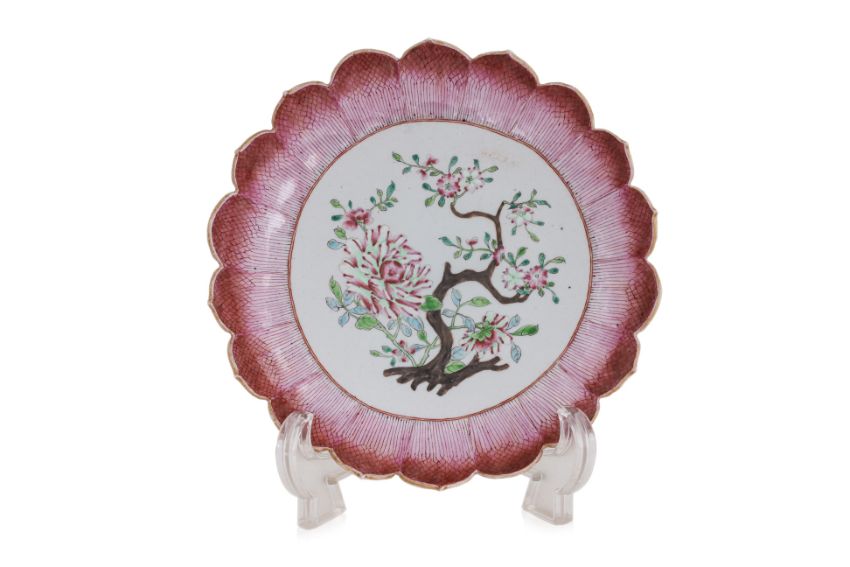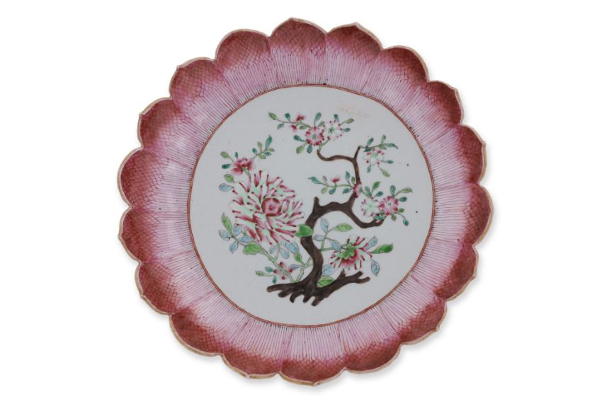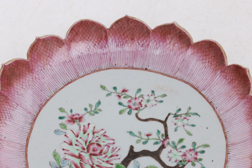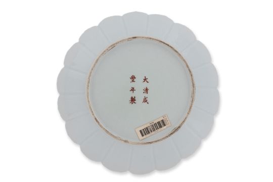 Circular dish with moulded lotus petal rim, decorated in central flowering tree, six character iron red Xianfeng mark