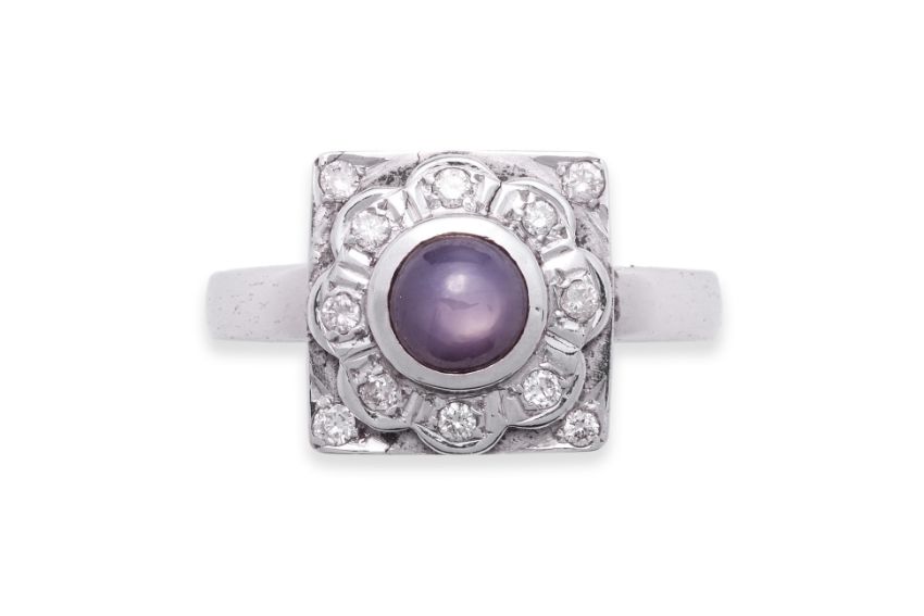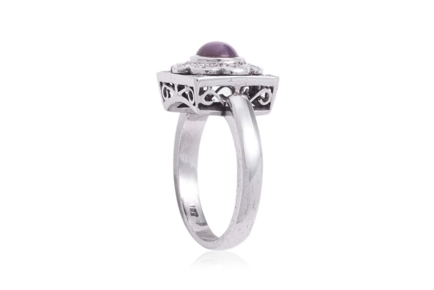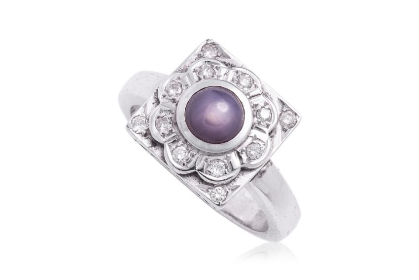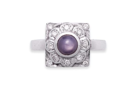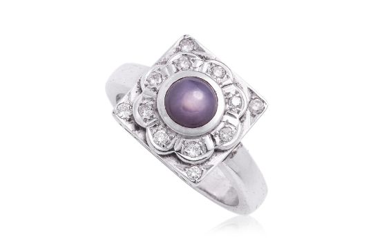 Featuring a purple star sapphire weighing approximately 1.00 Cts, mounted in a white gold setting indistinctly marked '18K', accented with round brilliant cut diamonds totalling approximately 0.18 Cts.