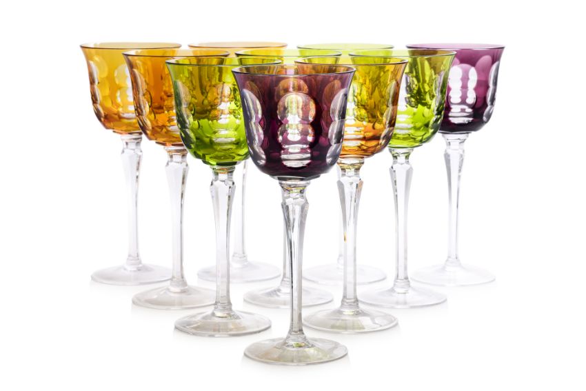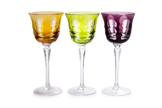 Comprising four amber, four green and two purple, each with cut to clear design and faceted stems, marked to base