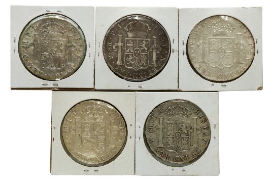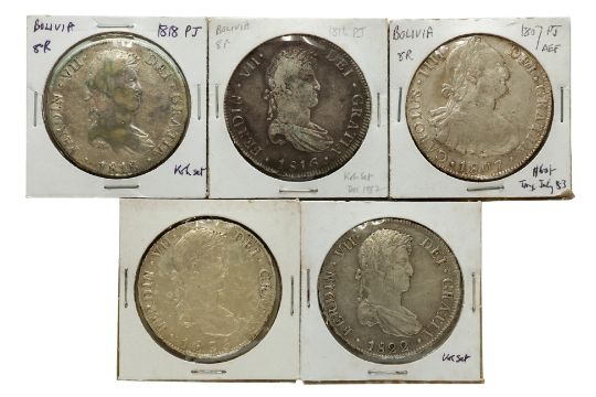 Comprising: Charles IV (Numerals IIII) 1807 PJ, noted as AEF; Ferdinand VII 1816 PJ; 1818 PJ; 1822 PJ and 1825 JL, all well circulated, approx F-VF