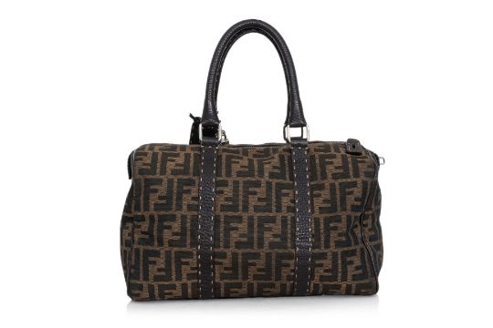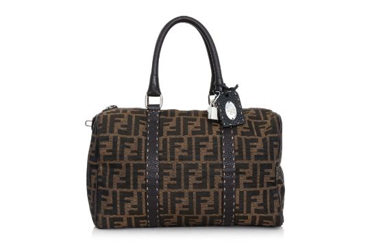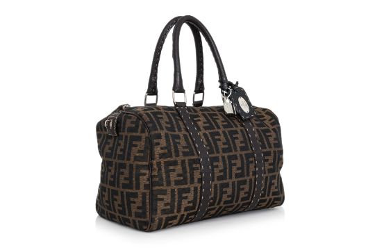 With monogrammed exterior with leather detailing and twin rolled handles. padlock and key fob with sterling silver 'Fendi' plaque, zip closure with single internal compartment
